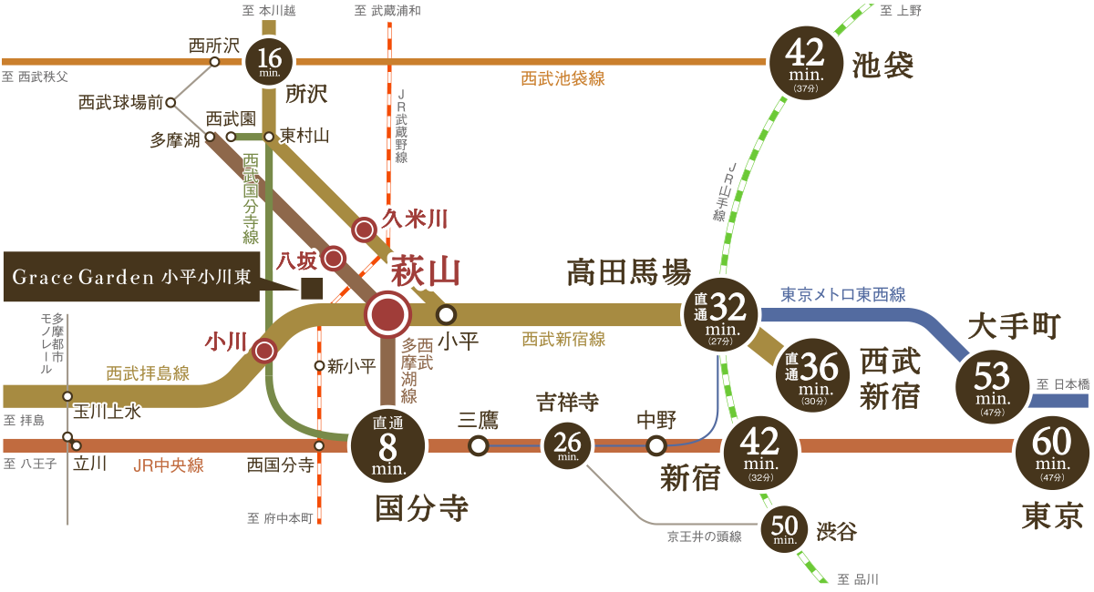 「萩山」駅から都心方面へ通勤、通学の際も、ゆったりとご利用いただけます。