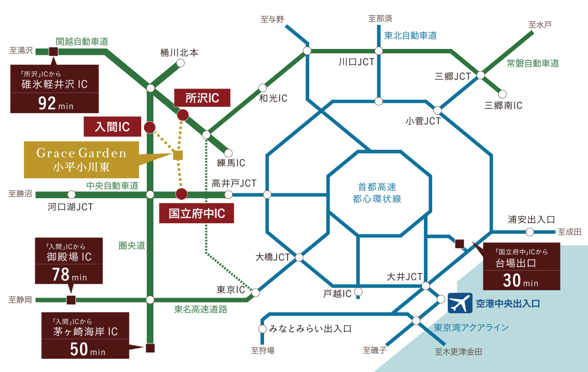 最寄りの「国立府中I.C」からは都心やレジャースポットなどへ軽快なアクセスが可能。