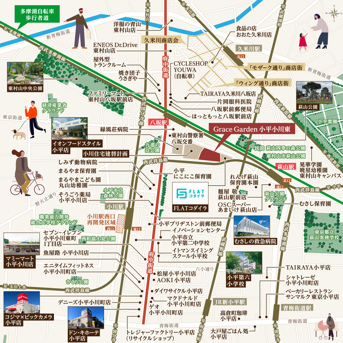 「国分寺」駅周辺も生活圏におさまるポジショニング。国分寺エリアの利便性やカルチャーまでもがライフシーンを彩る1つの要素となっています。レジデンス周辺は、久米川や小川など生活利便性に溢れた住環境が広がっています。