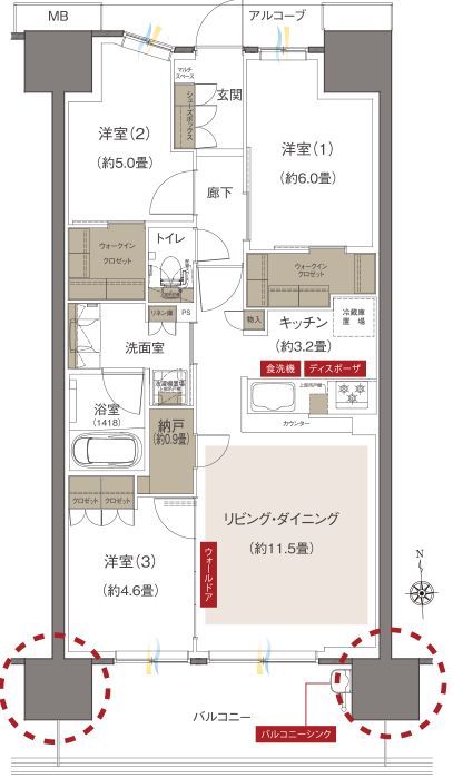 POINT2バルコニーシンクを備えた奥行き約2mの広々としたバルコニー