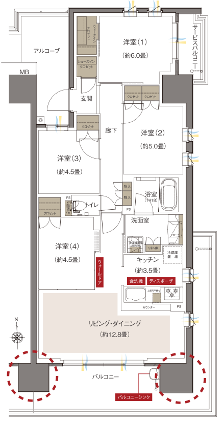 POINT1アルコーブからクランクイン玄関へプライバシー性を高めた南向き4LDK角住戸